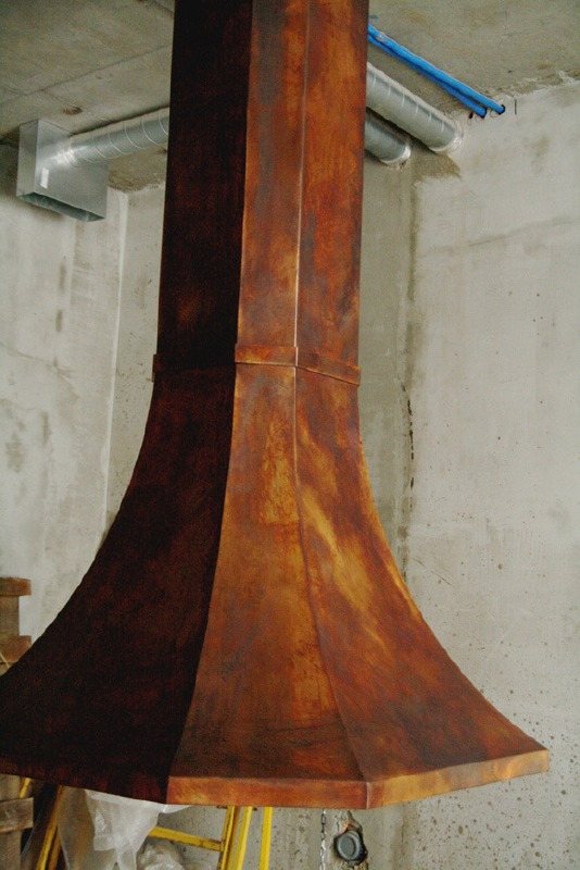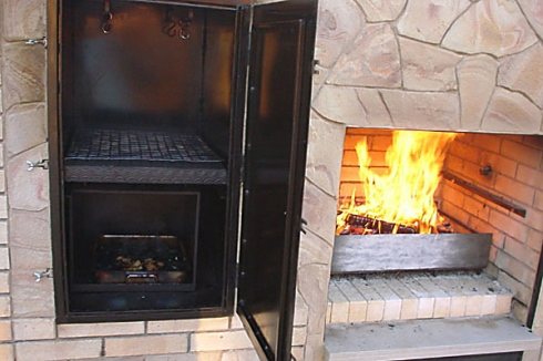 La touche finale. Nous installons des accessoires pour la cuisine - une plaque de cuisson, une porte de foyer et un ventilateur. Nous réparons tout avec des chevilles en béton.