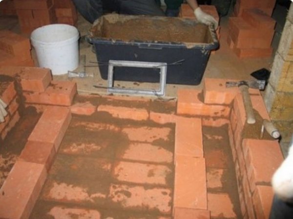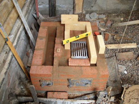 - La préparation du cendrier et du ventilateur commence à partir de la deuxième rangée. À travers cette chambre, l'air de combustion sera aspiré et il est également pratique d'éliminer les cendres. Toutes les briques sont décalées, l'épaisseur du joint est inférieure à 5 mm. Maçonnerie - uniquement pour mortier d'argile.