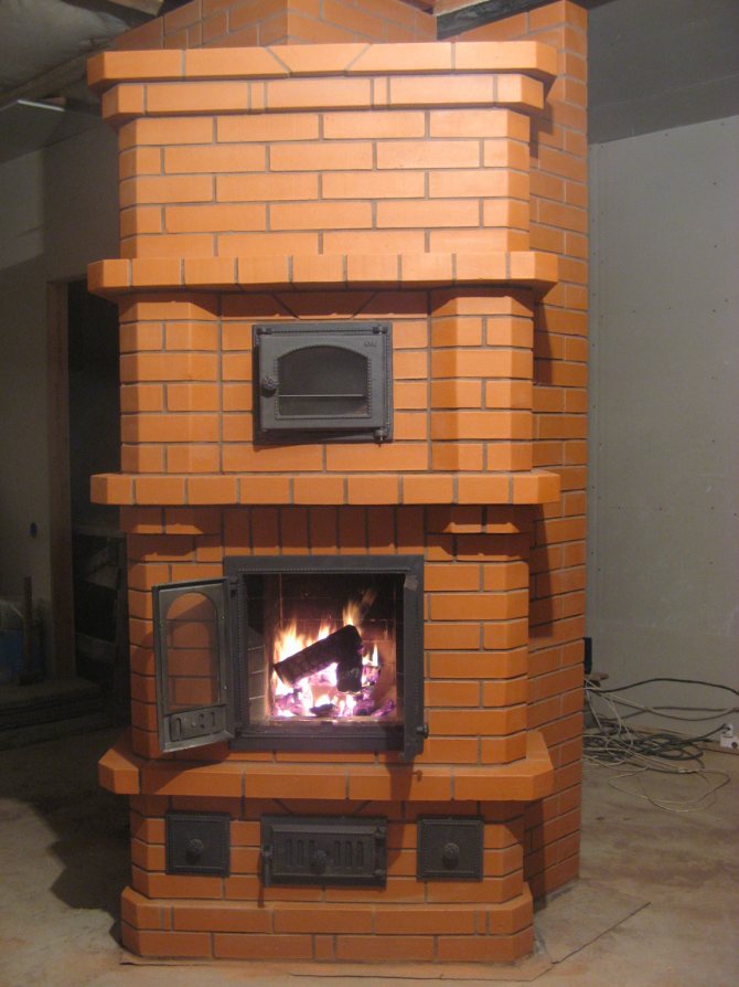 Une cheminée est disposée à l'intérieur d'elle avec plusieurs canaux, mais il est possible de faire passer la fumée directement dans la cheminée - c'est très pratique en été, lorsque le chauffage de la pièce n'est pas nécessaire. En raison de leur taille, de tels fours peuvent être équipés d'une table de cuisson et disposent le plus souvent d'une plaque de cuisson.