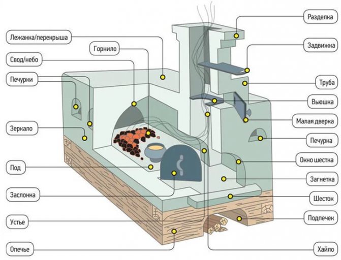 Photo 1. Schéma de la structure d'un poêle russe classique, en briques, indiquant les parties de la structure.