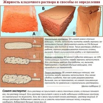 Mélange correctement fait "chuchote" - fait une sorte de bruissement, et traîne derrière la pelle. Vous pouvez également plonger la truelle dans le mélange, la retirer, puis la retourner. Si une couche épaisse colle, la composition est trop grasse, elle doit être diluée avec du sable. Si la couche de solution tombe, il y a un excès de sable, vous devez ajouter de l'argile pure.