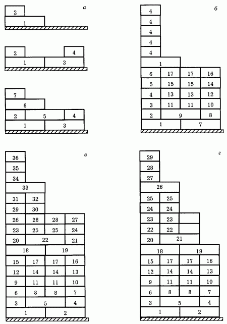 La séquence de pose de briques: a - système de dressage à une rangée; b - système de dressage à plusieurs rangées; c, d - système de dressage à plusieurs rangées de manière mixte.