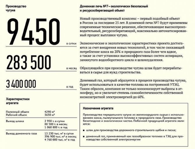 Le nouveau complexe assure la production de plus de 9450 tonnes de fonte par jour, le volume utile du four est de 490 mètres cubes et le volume de travail est de 3650 mètres cubes. La conception du haut fourneau garantit une production de fonte sans déchets et respectueuse de l'environnement; le gaz de haut fourneau pour les centrales thermiques et le laitier utilisé dans la construction de routes sont obtenus comme sous-produits.