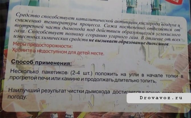 Donnant des recommandations détaillées sur la façon d'utiliser la bûche ramoneur, le mode d'emploi contient une description détaillée de l'étape de nettoyage obligatoire - éliminer les déchets des éléments du foyer ou du poêle à bois.