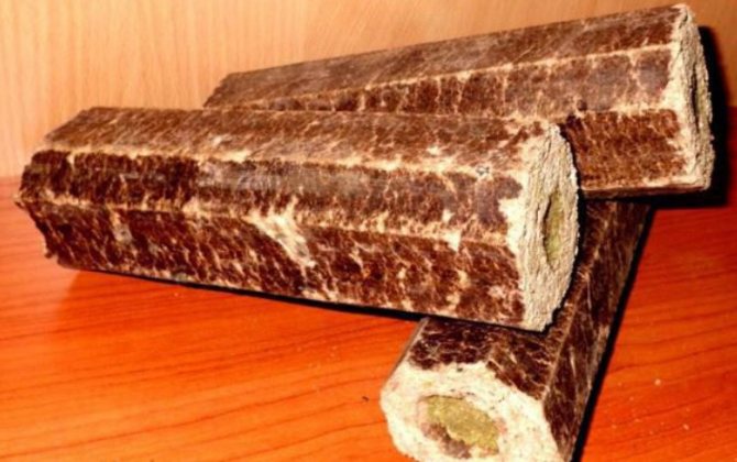 La bûche artificielle est une briquette rectangulaire brune avec des coins doux. Être avec d'autres bois de chauffage, ce n'est pas frappant. Il est presque impossible de reconnaître de l'extérieur que le nettoyage est en cours.