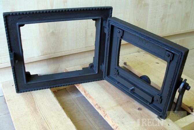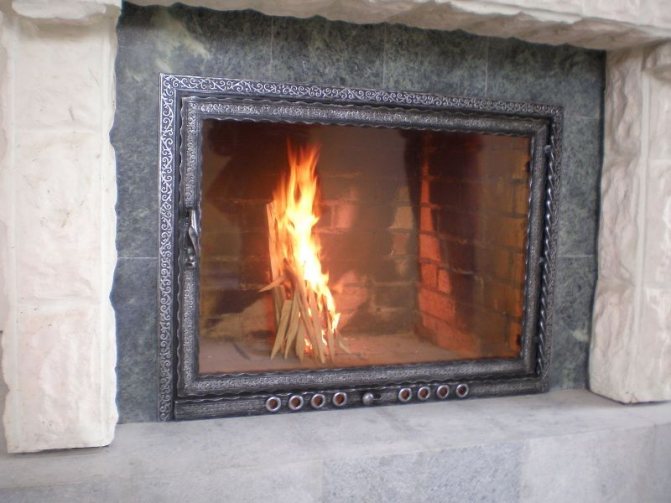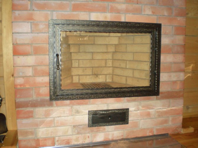 La porte de cheminée est fixée avec des charnières spéciales sur un cadre-cadre en acier ou en fonte. Les poignées sont en matériau non chauffant. Le choix entre les cadres en acier et en fonte dépend des préférences décoratives du client. Récemment, cependant, les cadres en acier sont encore préférés, car la fonte, qui résiste à des températures élevées, est sujette à une usure physique.