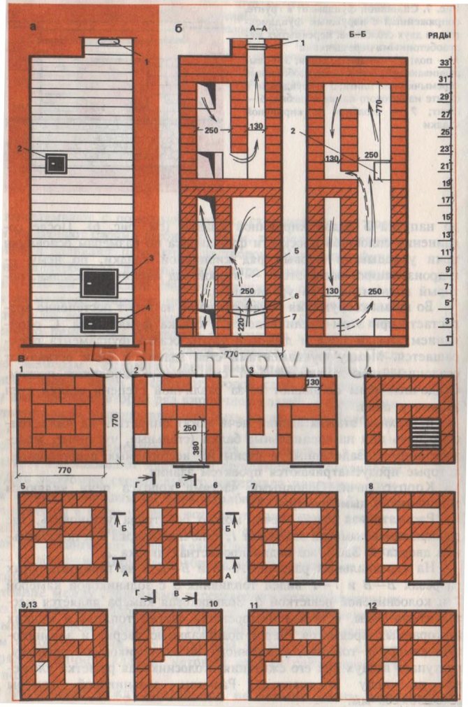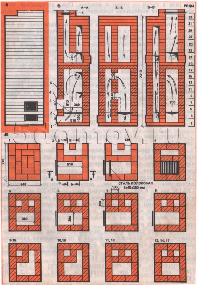 Vous trouverez ci-dessous une procédure détaillée de pose d'un poêle de chauffage d'une taille de 770 × 640 mm. La maçonnerie du reste des poêles chauffants est fondamentalement similaire à la maçonnerie du poêle susmentionné, par conséquent, leur maçonnerie sera décrite plus succinctement.