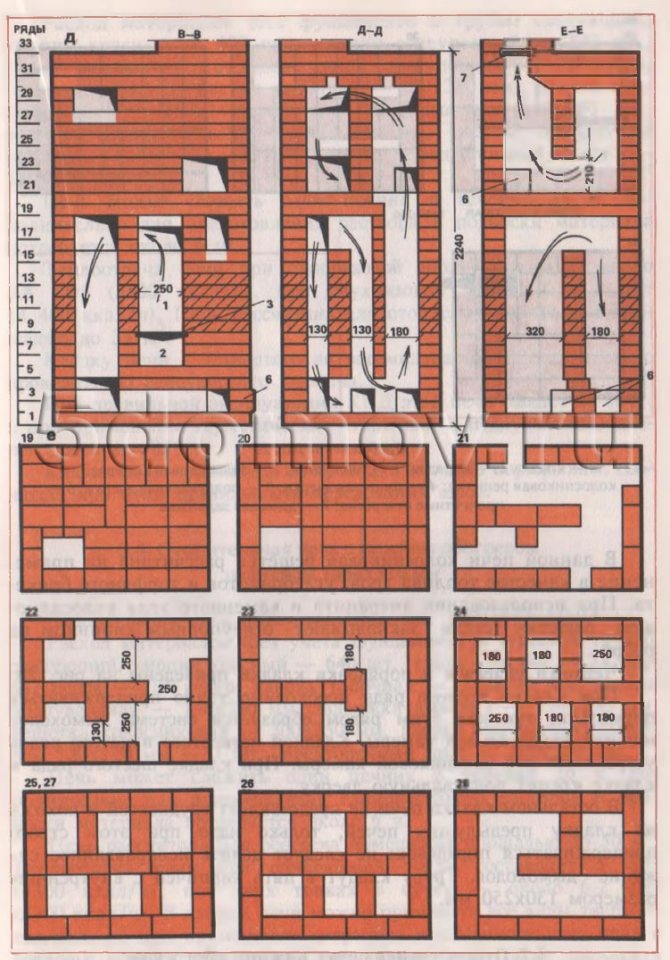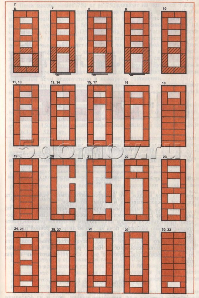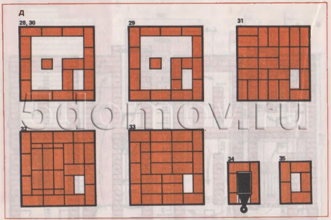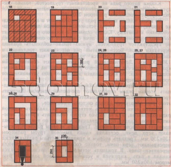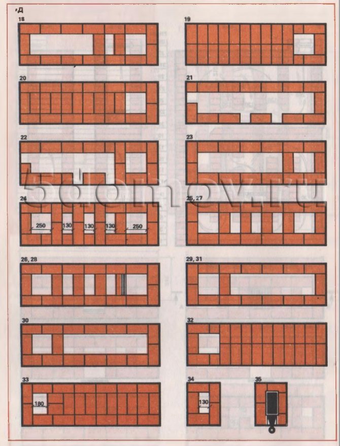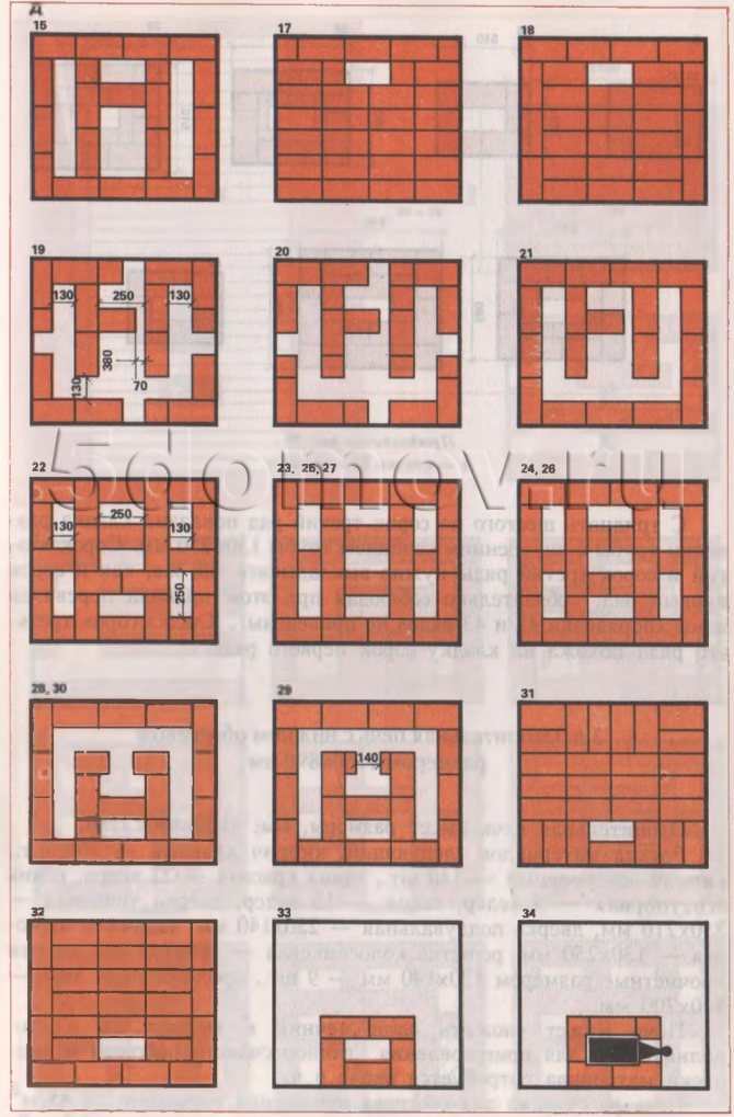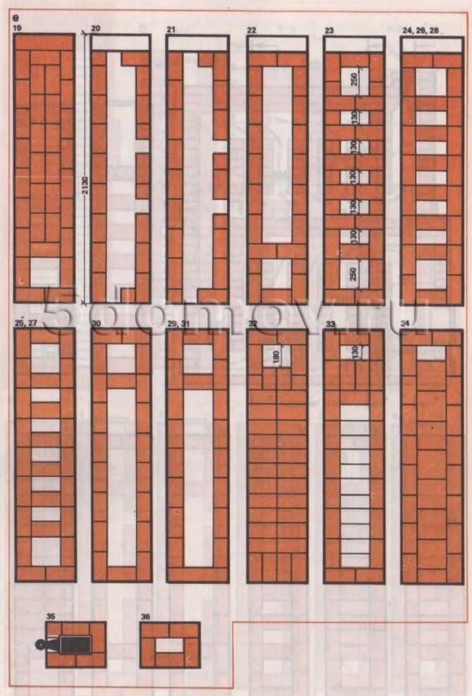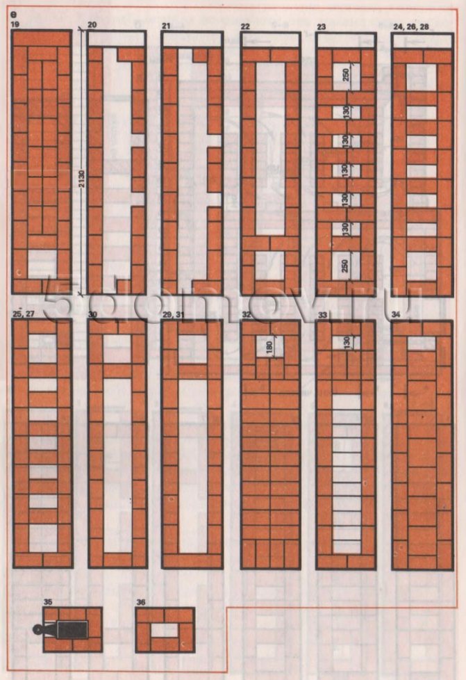 Maçonnerie de fournaise de la vingt-quatrième à la vingt-septième rangée est la même chose, il vous suffit de suivre strictement les règles de bandage des coutures. Maçonnerie de fournaise de la vingt-huitième à la trentième rangée effectuée conformément à la commande. Trente et unième rang couvrir le dessus du four en laissant un canal de cheminée de 130 × 250 mm. Trente-deuxième et trente-troisième rangées chevauchent également le dessus du four, ne respectez que les règles de bandage des coutures. Au trente-quatrième rang la maçonnerie est représentée (un canal de cinq briques et l'installation d'un volet de fumée d'une taille de 130 × 250 mm.