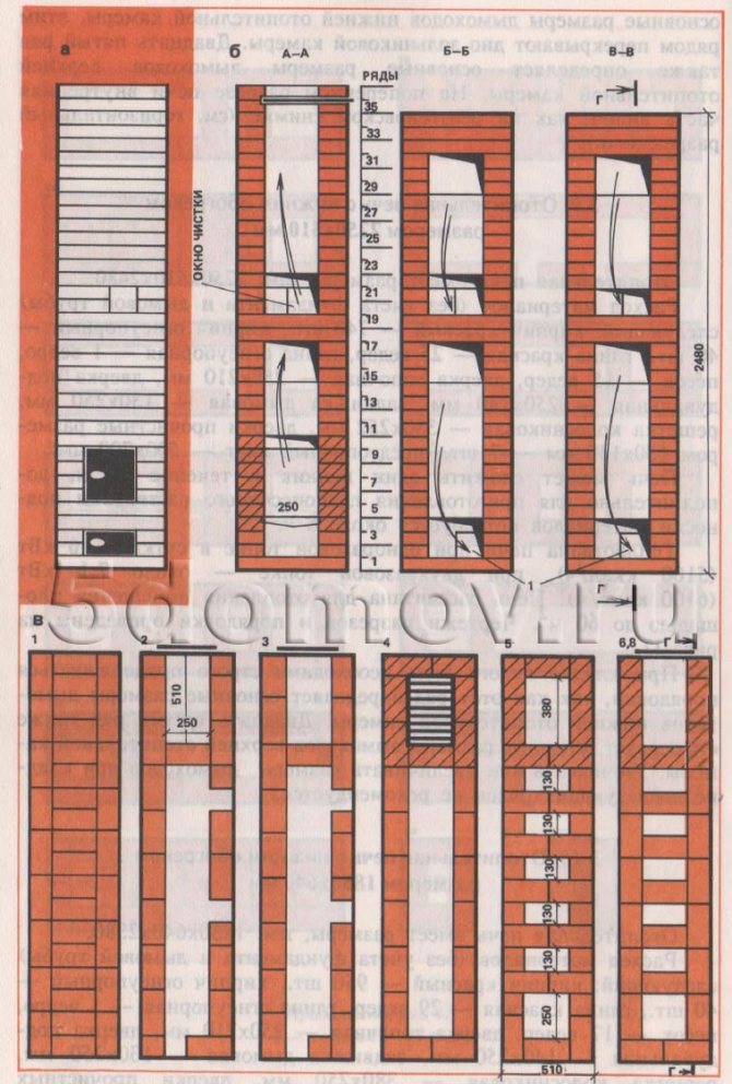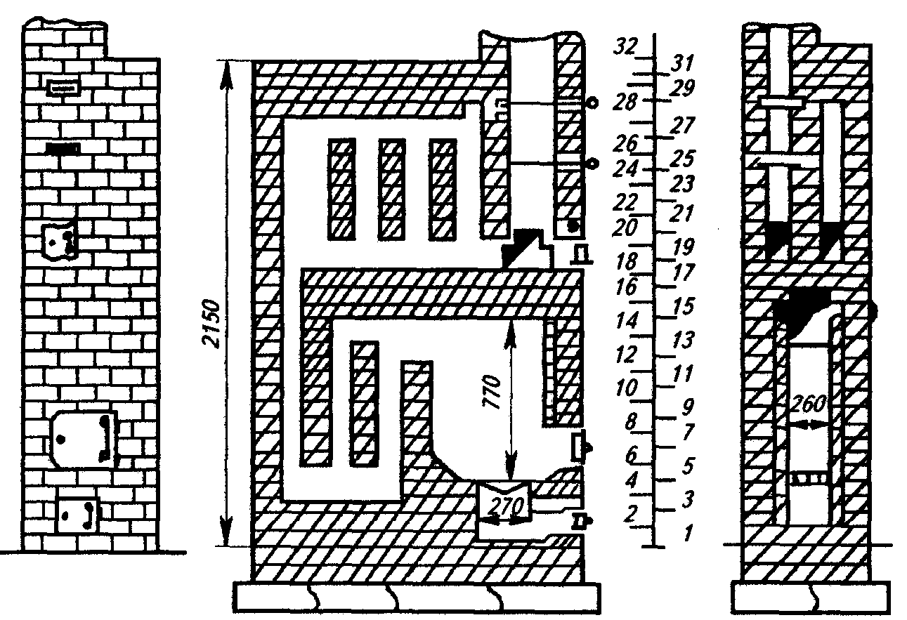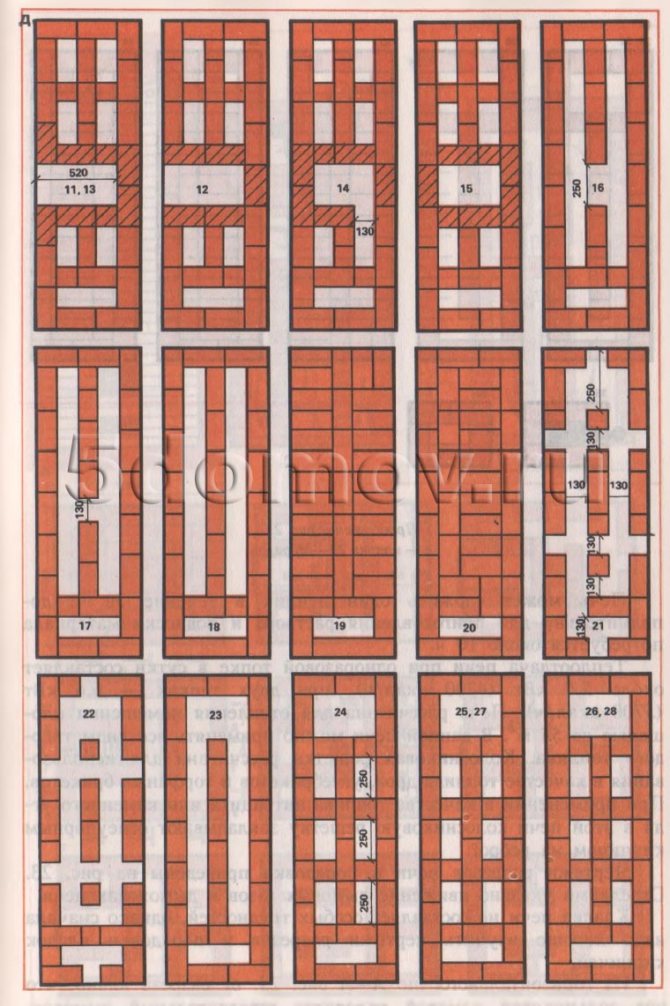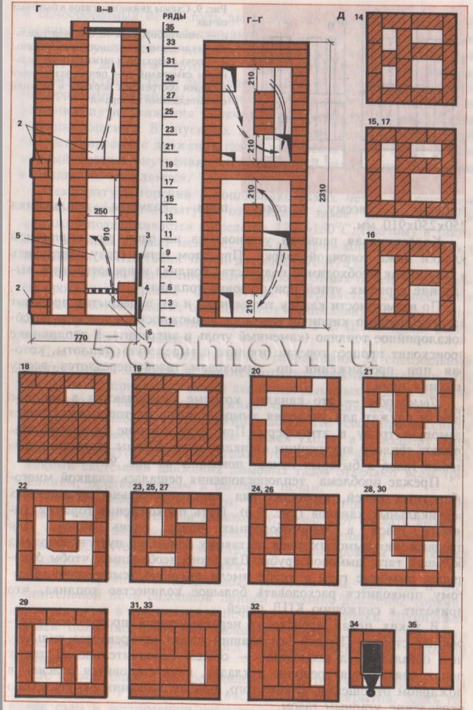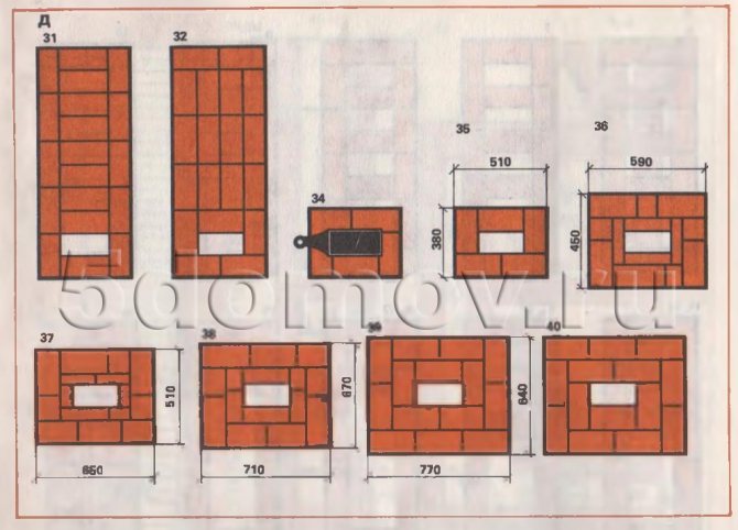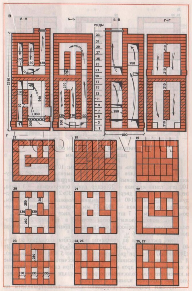 Maçonnerie de fournaise de la vingt-quatrième à la vingt-septième rangée est la même chose, il vous suffit de suivre strictement les règles de bandage des coutures. Maçonnerie de fournaise de la vingt-huitième à la trentième rangée effectuée conformément à la commande. Trente et unième rang couvrir le dessus du four en laissant un canal de cheminée de 130 × 250 mm. Trente-deuxième et trente-troisième rangées chevauchent également le dessus du four, ne respectez que les règles de bandage des coutures. Au trente-quatrième rang la maçonnerie est représentée (un canal de cinq briques et l'installation d'un volet de fumée d'une taille de 130 × 250 mm.