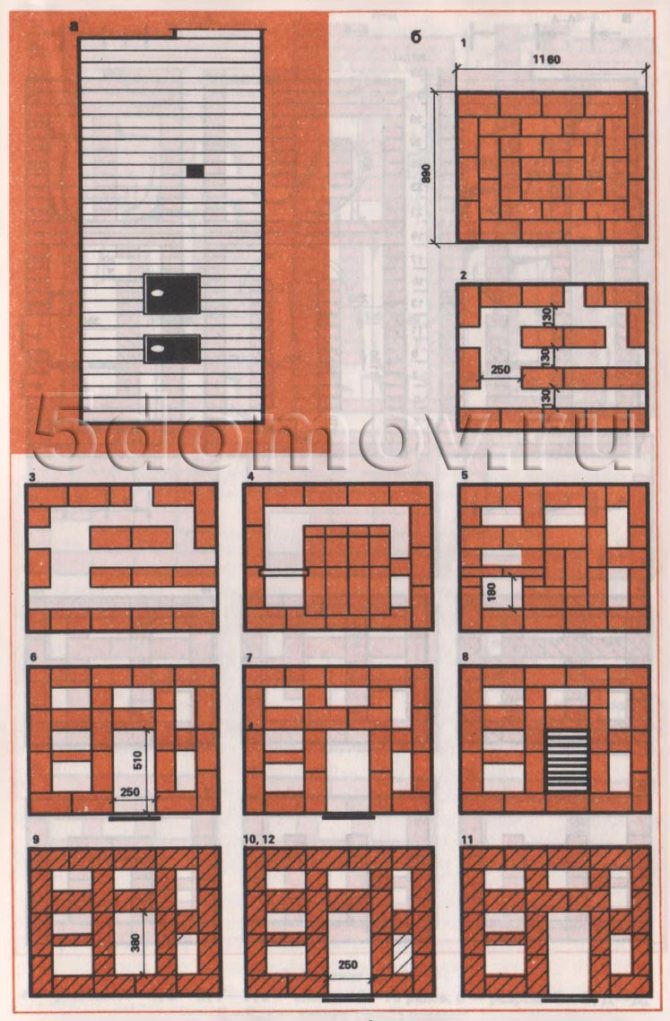 10e rangée - disposée en briques réfractaires aussi horizontalement que possible, car un sol en fonte y sera installé. Lors de la maçonnerie, seuls deux canaux de section carrée doivent rester avec le chevauchement de la porte de combustion. Contre la chambre de combustion de la paroi arrière, deux briques font saillie dans le four de 20 mm, ce qui est associé aux dimensions d'un poêle en fonte standard pour la chambre de cuisson.