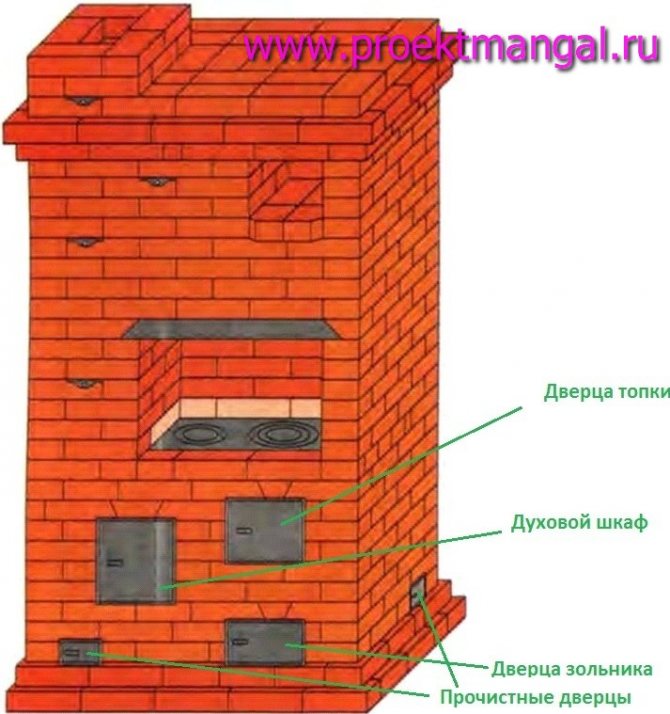 24-25 rangées - disposées avec un bandage des coutures de sorte qu'il y ait deux canaux sur le côté droit du four. Une porte samovar est installée.