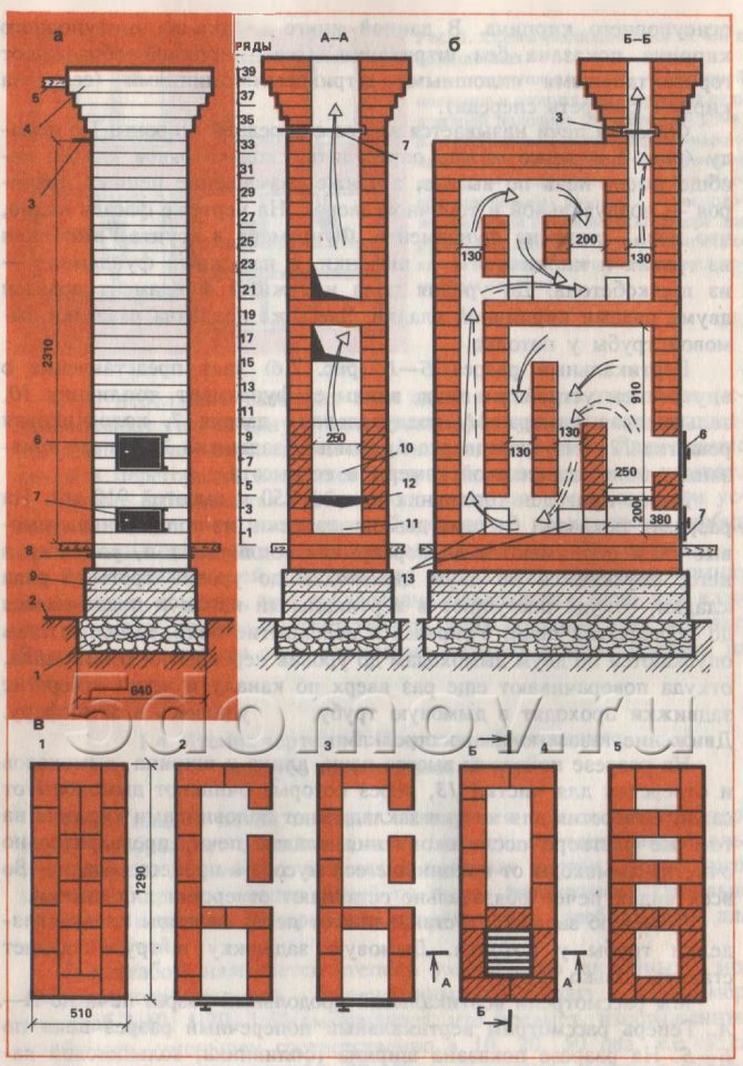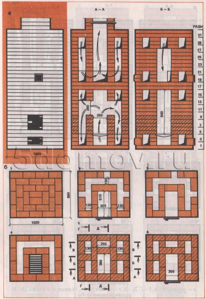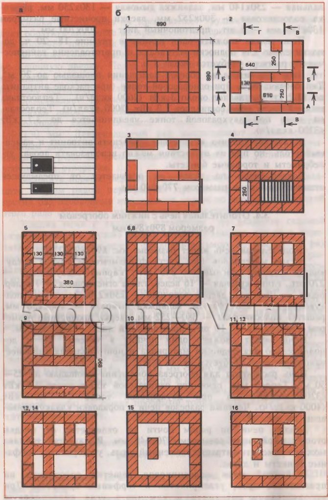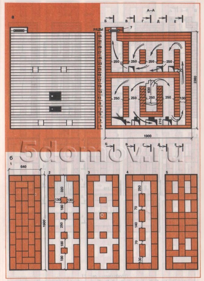 Figure. 9. Poêle chauffant avec chauffage par le bas, dimensions 1880 × 640 mm a - façade et section A - A; b - maçonnerie 1-5 rangées