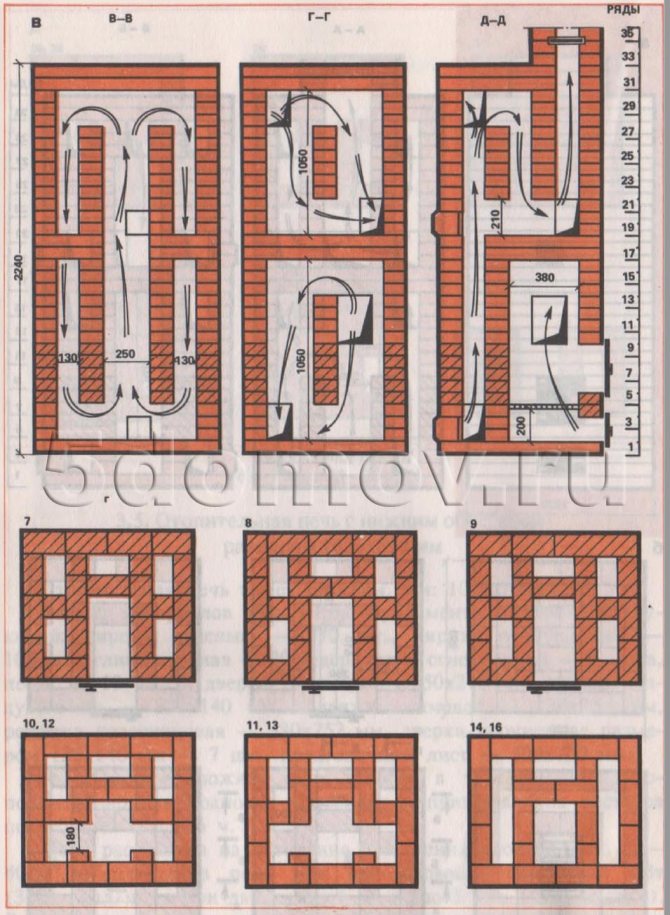 Figure. 9. Poêle chauffant avec chauffage par le bas de taille 1880 × 640 mm - sections B - B, C - C, G - G, D - D, E - E; d - lisser 6-10 rangs