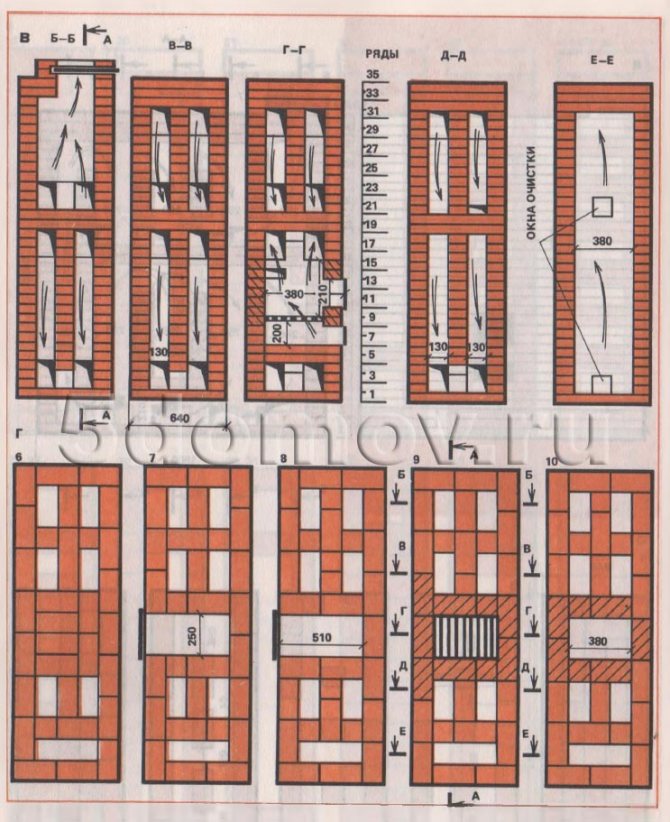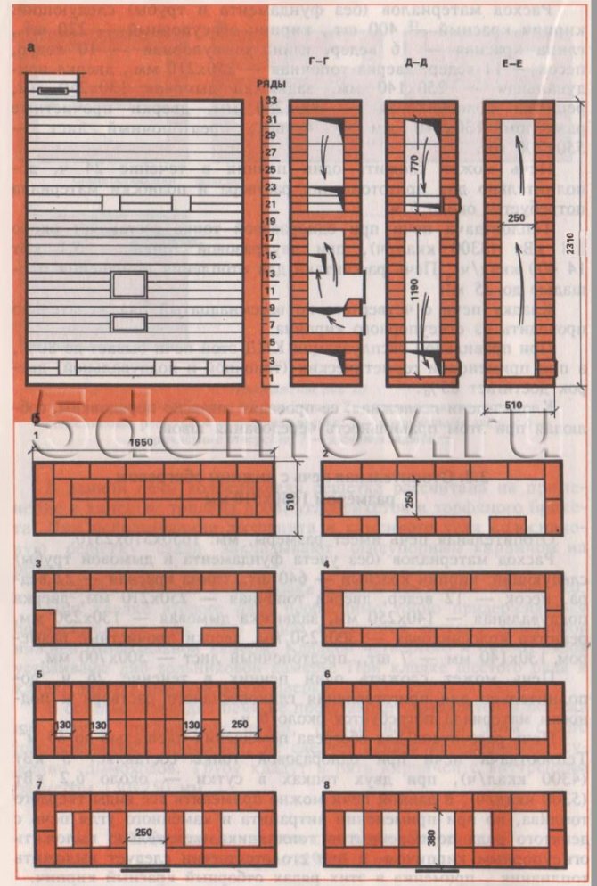 7ème rangée - disposée conformément à la commande. Le canal précédemment agencé sous la forme de la lettre P est recouvert de maçonnerie de telle sorte que trois canaux sont formés: deux carrés en demi-briques et un en une brique et demie. Une porte de combustion est installée, qui doit reposer sur la 6ème rangée et être fixée dessus.