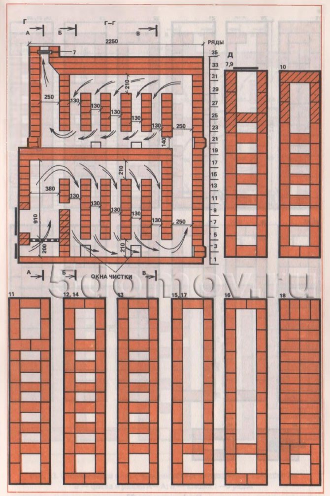 Lors de la pose de la deuxième rangée, vous devez respecter strictement l'ordre. La maçonnerie de la cinquième rangée détermine les dimensions principales des cheminées de la chambre de chauffage inférieure. La pose de la vingt et unième rangée doit également être effectuée strictement dans l'ordre, une cheminée d'une largeur de 130 mm est laissée au niveau du canal vertical. La maçonnerie de la vingt-quatrième rangée détermine également les principales dimensions des cheminées de la chambre de chauffe supérieure. Les autres rangées de la maçonnerie du four sont similaires à celles des fours précédents.