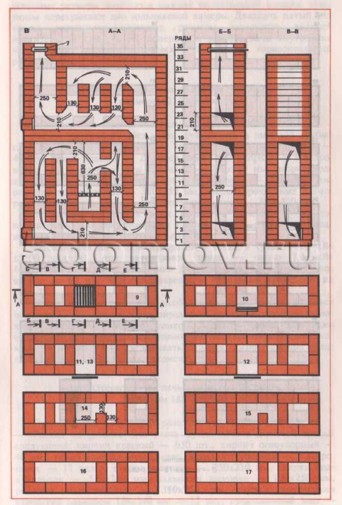 14, 15, 16 rangs - rétrécissement de la maçonnerie du foyer. Maçonnerie Haylo pour la sortie de gaz de la chambre de combustion.