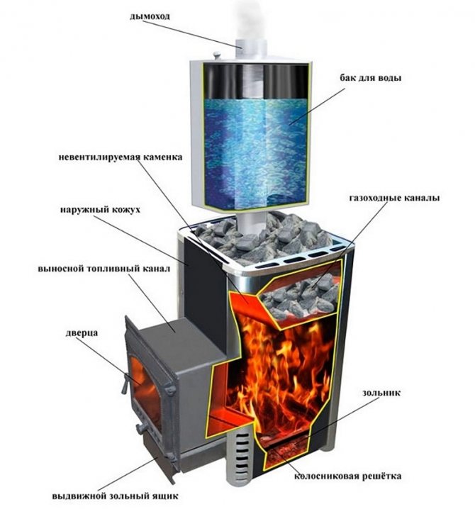 Les dispositifs de type samovar sont un conteneur scellé encerclant la cheminée. Dans le processus de chauffage du liquide, dans ce cas, la chaleur est utilisée à partir des produits de combustion se déplaçant à travers le tuyau.
