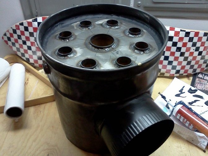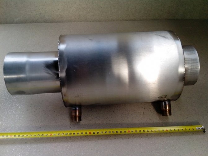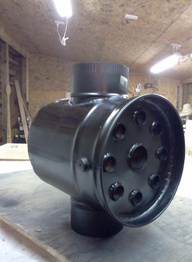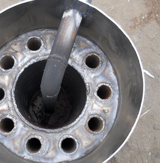 L'étape suivante consiste à fixer un tuyau d'un diamètre de 50 mm au trou central. Des tronçons de 30 cm de long sont soudés aux trous latéraux.A la suite des travaux effectués, un noyau d'échangeur de chaleur sera créé. Après cela, vous pouvez commencer à créer la coque de l'appareil.