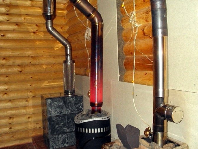 Parfois, l'échangeur de chaleur de la cheminée du bain est recouvert d'une grille remplie de pierres, elles servent à accumuler de la chaleur. La base de l'échangeur de chaleur peut être décorée dans ce cas. Le grenier se révélera plus confortable et, dans ce cas, vous pourrez utiliser la pièce comme salon. Comme le montre la pratique, la température du tube du four n'augmente pas de plus de 170°C s'il est complété par un échangeur de chaleur. La température la plus élevée ne sera que dans la zone de la porte, ce qui parle de sécurité et de confort.
