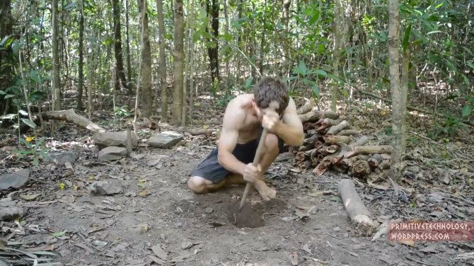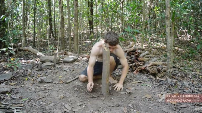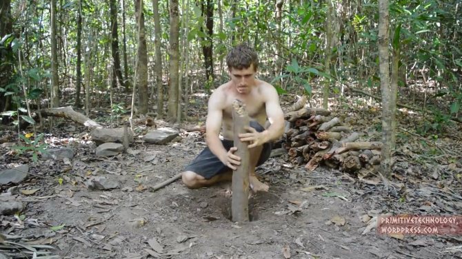 Maintenant, l'auteur creuse un petit trou et y place la plus grosse bûche verticalement. Puis il le dépose.