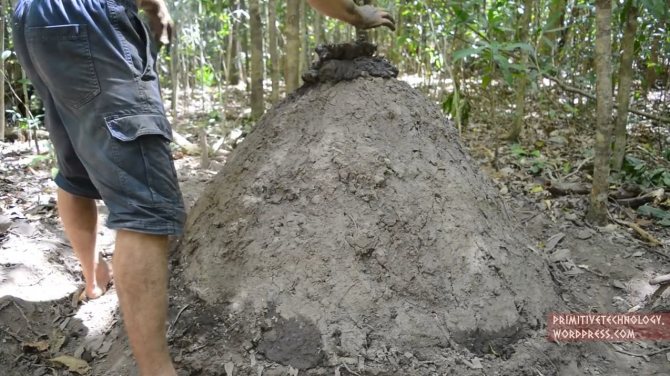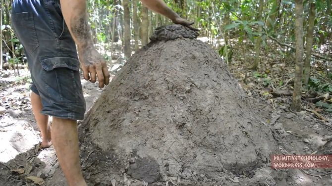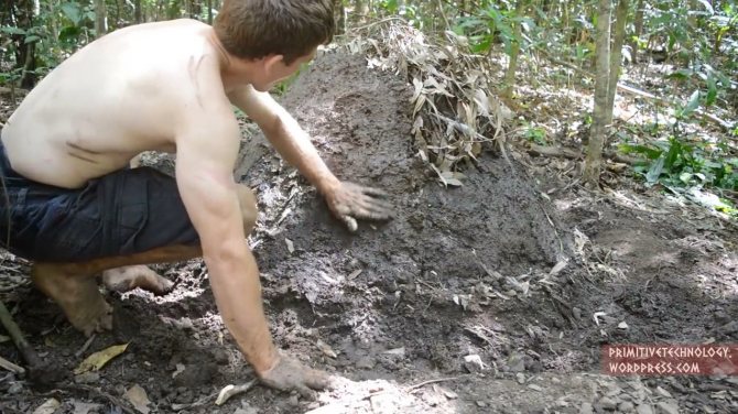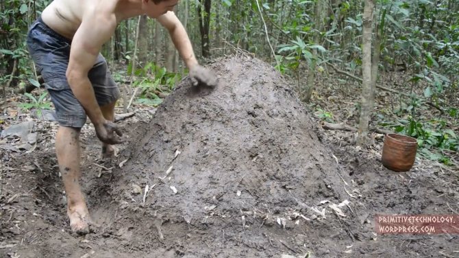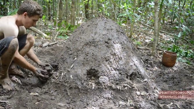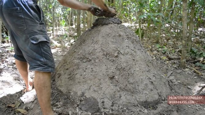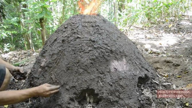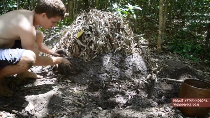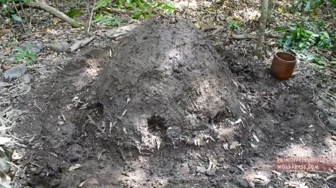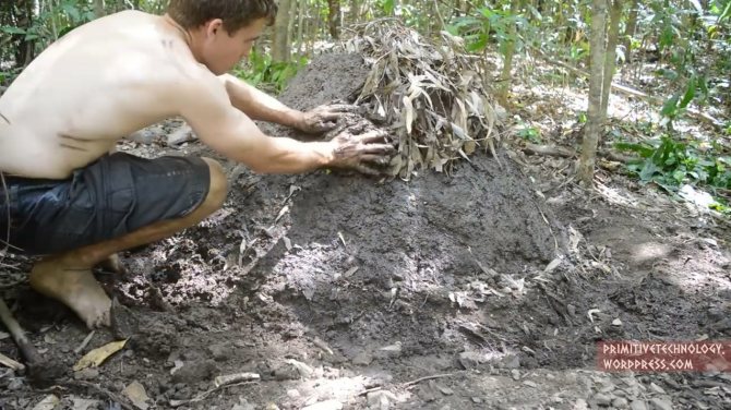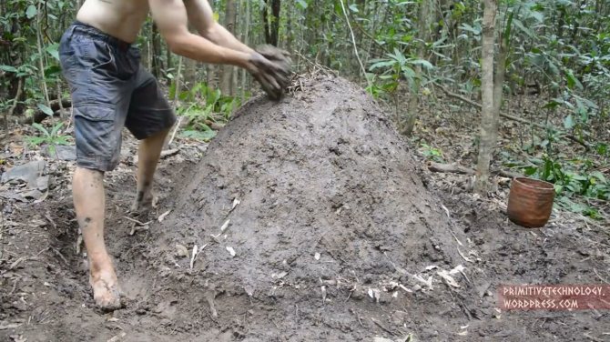 En couche dense, essayant d'éviter les fissures, il pose la partie supérieure du manteau de fourrure, laissant un trou au sommet du monticule pour que la fumée et les gaz s'échappent. La surface du manteau de fourrure s'humidifie légèrement avec de l'eau et se lisse.