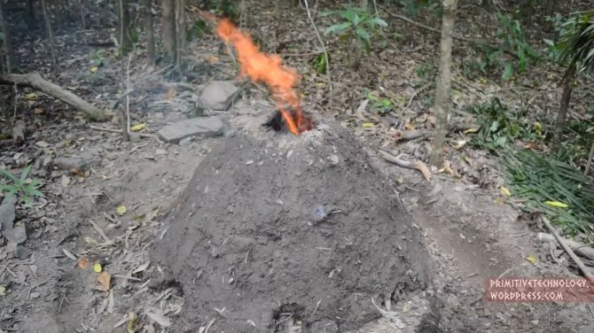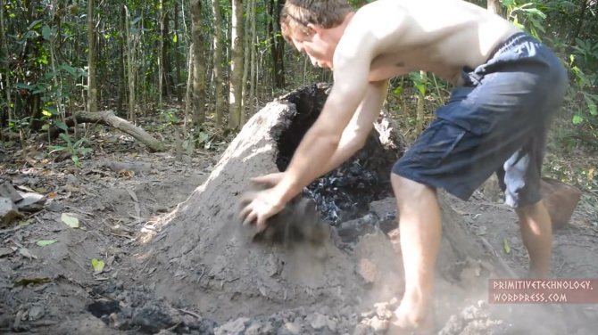 - Lorsque tout le bois de chauffage superposé a pris feu et que le feu est apparu d'en haut, vous devez couvrir le feu avec un couvercle ou une feuille de fer. Ensuite, saupoudrez le tout de terre pour bloquer au maximum l'accès à l'oxygène. Vous pouvez également jeter des herbes crues par-dessus. La chose la plus importante est que le couvercle affleure le sol et ne repose pas contre le bois.