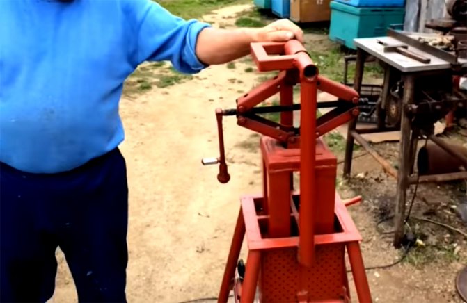 En tournant la poignée du cric, l'opérateur abaisse les plates-formes jusqu'à la butée. Toute l'eau pressée est évacuée par la gouttière dans un seau - elle sera ensuite réutilisée.