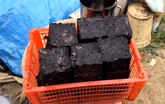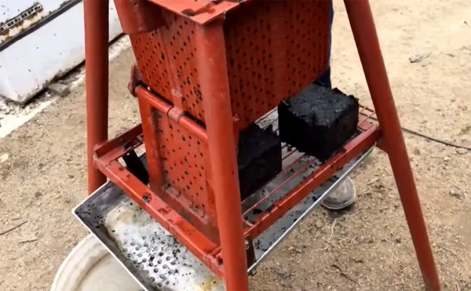 Une fois le cric soulevé, le couvercle est ouvert par le bas sous les compartiments et les briquettes sont extraites à l'aide d'un batteur. En apparence, ce sont des cubes noirs ordinaires.En fait, une briquette bien séchée peut se transformer en charbon, qui fournira de la chaleur 4 à 6 fois plus longtemps qu'une bûche de bouleau. Et ce malgré le fait que le coût de fabrication d'un tel carburant n'est pratiquement pas nécessaire - seulement un peu d'eau et d'électricité pour faire fonctionner la machine à laver.