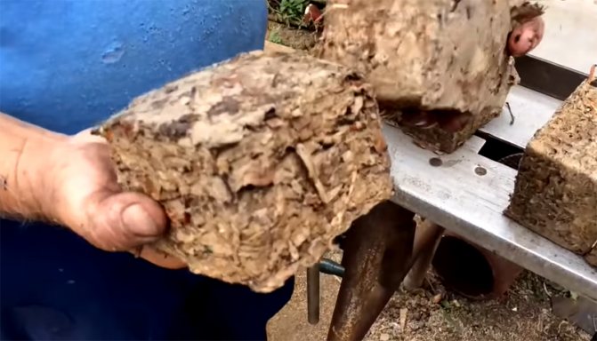 Le vérin est conçu de manière à neutraliser les efforts humains.Cependant, il arrive un moment où même lui n'est pas capable de pousser les plates-formes plus loin. Ensuite, vous devez attendre quelques minutes jusqu'à ce que le liquide restant s'écoule et vous pouvez obtenir des briquettes presque prêtes à l'emploi. Pourquoi presque ? Oui, ils ont juste besoin de bien sécher. Alors qu'ils sont crus, ils peuvent être brisés en les laissant tomber de leur hauteur. Mais lorsque les briquettes sèchent, il devient difficile de les casser même avec un marteau.