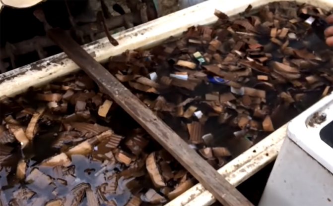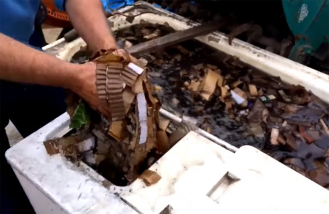 Le carton est coupé en lanières et trempé dans l'eau pendant au moins un jour et demi