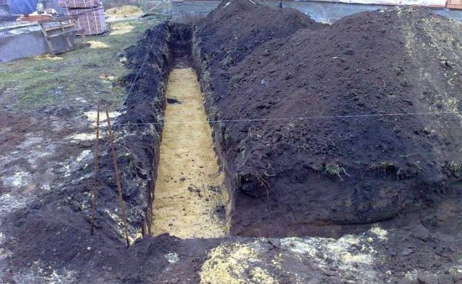 - Selon les marquages, une fosse ou une tranchée est creusée à une certaine profondeur, cela dépend directement du type de future fondation choisi.Une fosse ou une tranchée est creusée avec une excavatrice ou manuellement avec une pelle.
