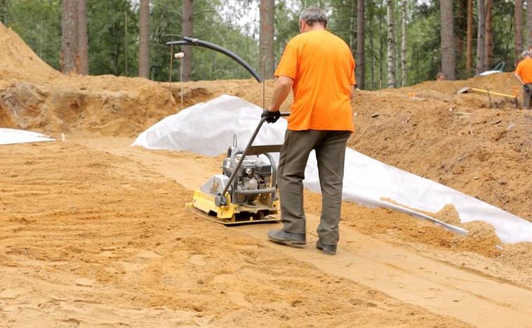 Pour le remblayage, il est préférable d'utiliser du sable à gros grains ou de taille moyenne. Une condition préalable est la quantité minimale d'inclusions d'argile. L'épaisseur de la couche est de 10 à 70 cm.Il est possible de tasser en un seul passage une couche jusqu'à 5 cm d'épaisseur, c'est pourquoi le processus de formation d'un coussin de sable est long et laborieux.