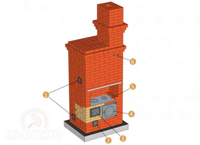 Sur les 16-17 rangées, un morceau de tuyau avec un bouchon est encastré dans la maçonnerie, ou une porte standard de 140x140 mm est installée pour ventiler la chambre de cuisson, qui sur la 18e rangée est recouverte de briques reposant sur des coins en acier ou des bandes métalliques .