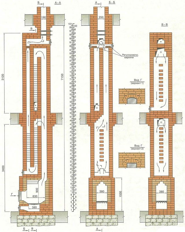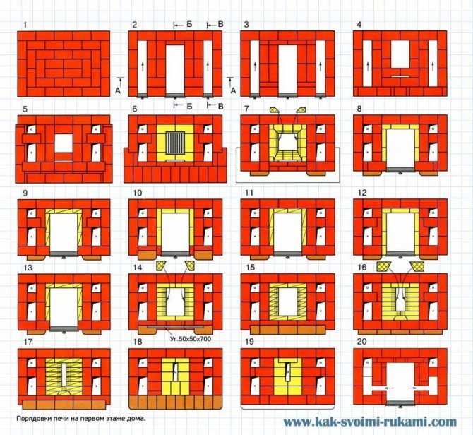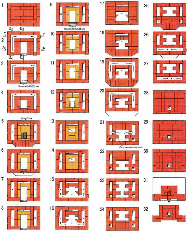 Sur les 20-21e et 25-26e rangées pour le nettoyage des sections horizontales du chemin de fumée, deux autres portes de nettoyage doivent être installées ou deux moitiés de briques doivent être posées à leur place.