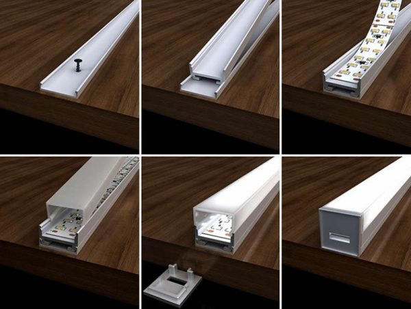 Les profils LED LED sont désormais très populaires et sont utilisés partout. Ainsi, des conceptions similaires décorent les étagères des magasins, les ensembles de cuisine, les escaliers et les balustrades, les salles de bains, les routes et les trottoirs.