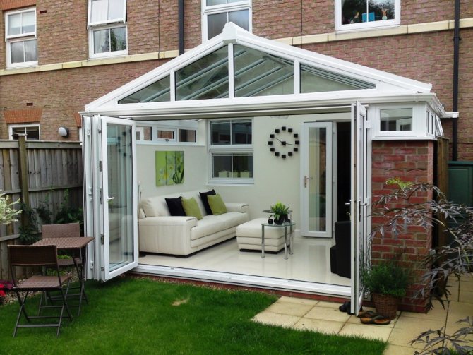 Puisque la véranda est attachée à la maison et, en fait, est son ajout, elle doit être suffisamment chaude et le vitrage doit être étanche à l'air et isolant thermique. Par conséquent, le polymère est parfaitement adapté à ces fins. Parmi les avantages d'une telle fenêtre pour un gazebo, en plus de ses propriétés isolantes, le poids se démarque également - un tel système pèsera beaucoup moins qu'un métal-plastique ou un verre, donc la charge sur la structure est réduite.