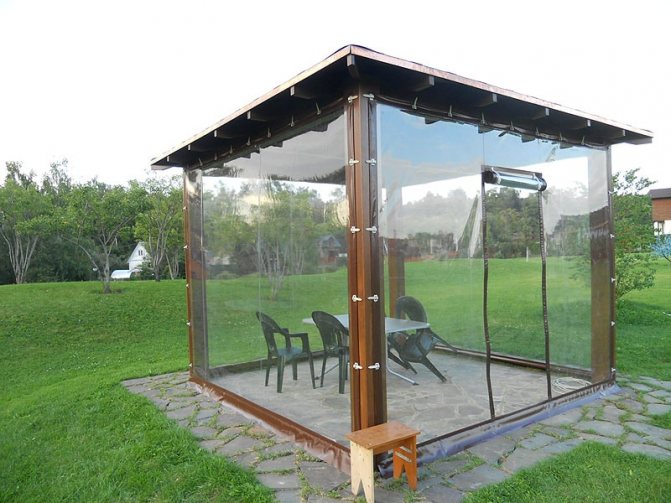 L'essence du vitrage souple des gazebos est d'utiliser un film PVC flexible au lieu du verre ordinaire - une option avantageuse en termes de prix et de qualité... Il est plus difficile d'endommager le film que le verre. Protège des intempéries avec le même succès, et vous pouvez aborder le design avec un film avec originalité, en utilisant des palettes multicolores.
