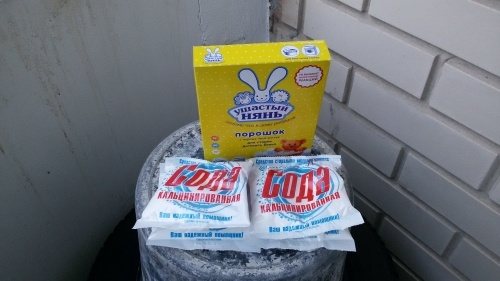 - Mélangez le bicarbonate de soude (1 cuillère à soupe), la lessive en poudre (1 cuillère à soupe) et l'eau (500 ml).