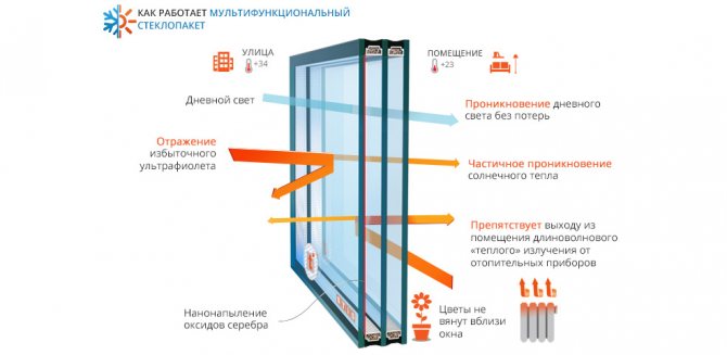 Le verre sur les fenêtres est la surface la plus froide de la pièce, c'est à travers elle que se produit l'essentiel de la perte de chaleur. Afin de retenir la chaleur à l'intérieur de la pièce et de garder le froid à l'extérieur, les vitrages isolants sont équipés de verre à faible émission avec un revêtement i ou k d'oxydes métalliques. Cette couche réfléchit les rayons de chaleur, les renvoie dans la pièce, retient la chaleur en hiver, la protège de la surchauffe en été. Dans le même temps, la pulvérisation n'interfère presque pas avec la pénétration de la lumière du soleil dans la pièce.
