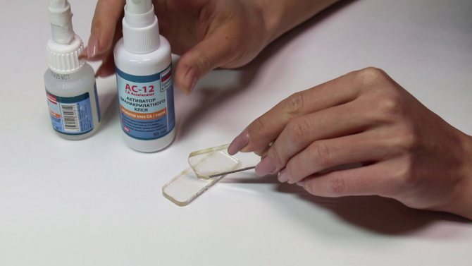 Important! De plus, vous pouvez acheter un activateur de colle cyanoacrylate "Cosmofen" AC-12. Ce produit est fabriqué sous forme de spray. Son objectif principal est d'améliorer les performances de tous les types d'adhésifs à base de cyanoacrylate.