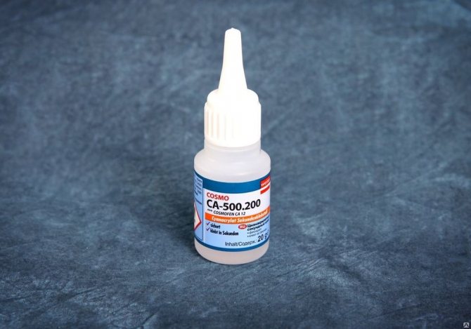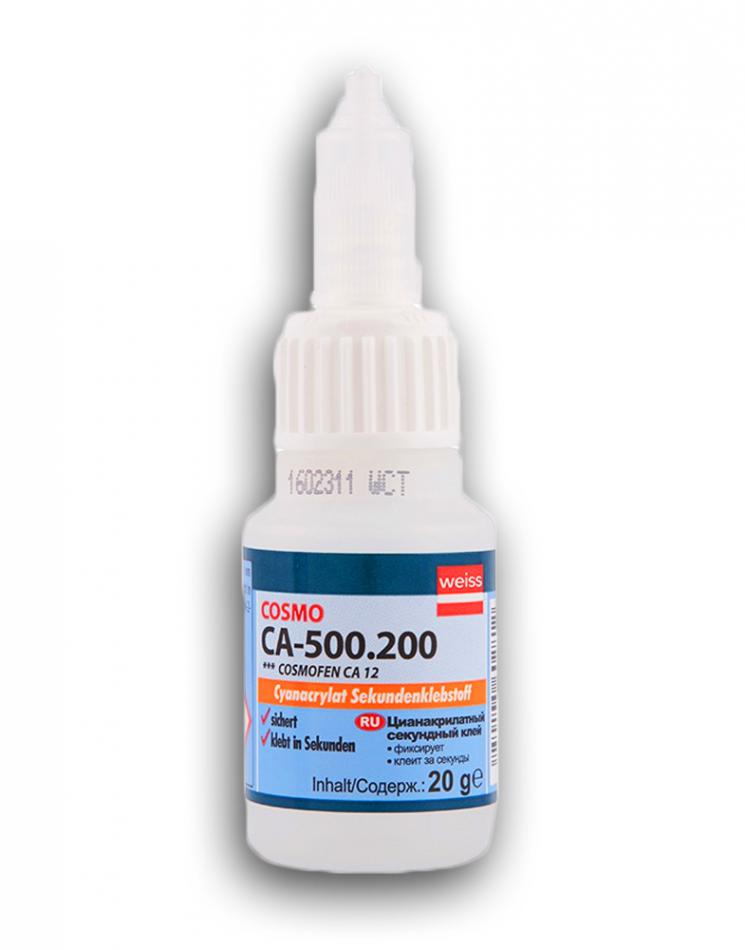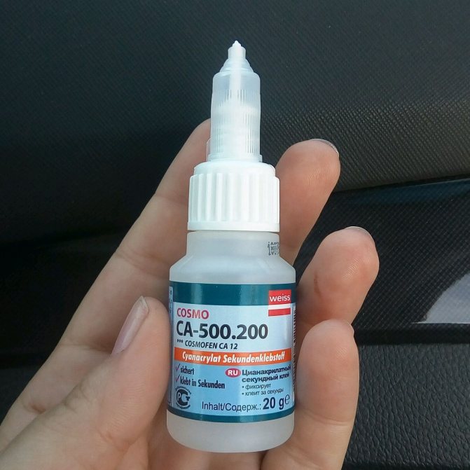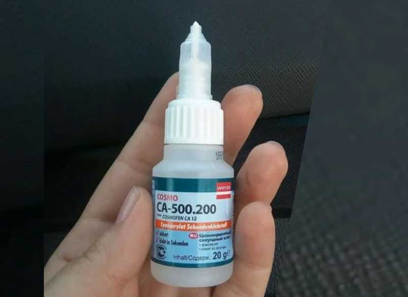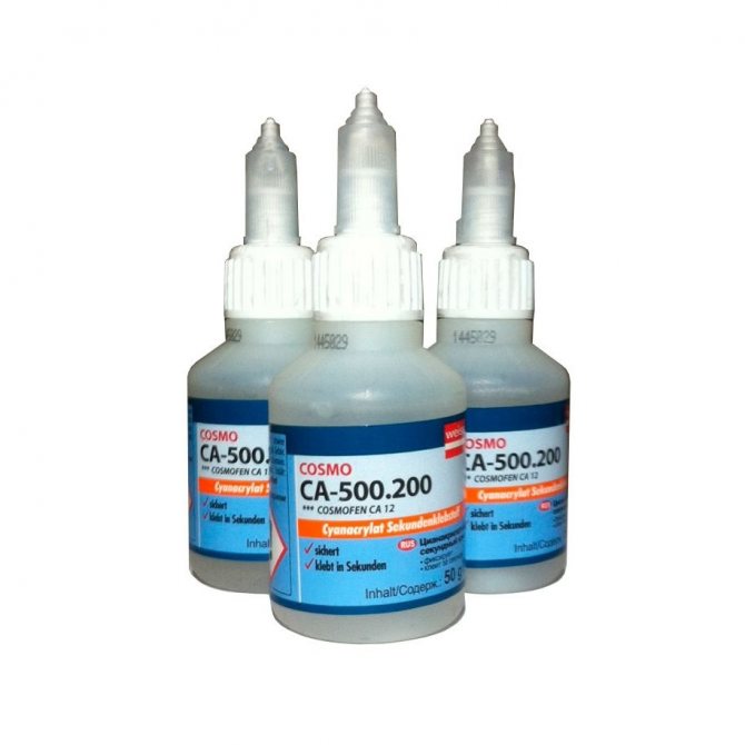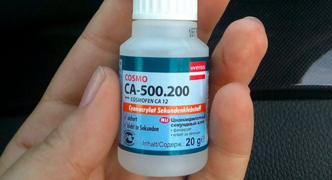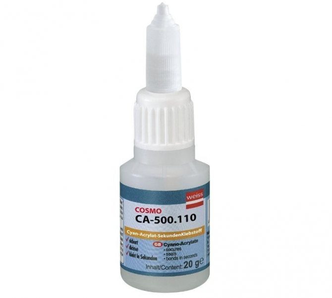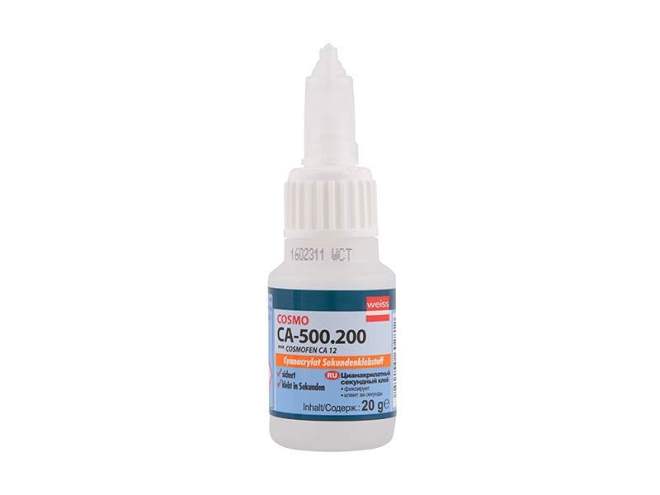 - Cosmo - 500.200 (deuxième cyanoacrylate). A une fixation instantanée. Convient à tous les matériaux courants. Après l'application, vous obtenez des coutures durables et résistantes à l'humidité qui ne craignent pas les changements de température et les produits chimiques agressifs.