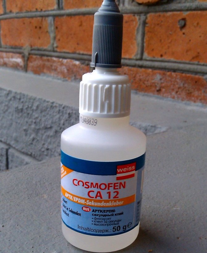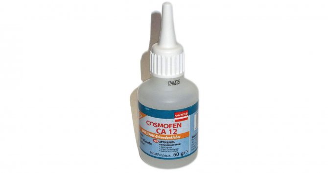 Important! Quel que soit le type, la super colle Cosmofen durcit très rapidement en raison de la présence de cyanoacrylate dans la composition. Par conséquent, le travail doit être effectué le plus rapidement possible - il est peu probable qu'il soit possible de corriger la position des pièces connectées.