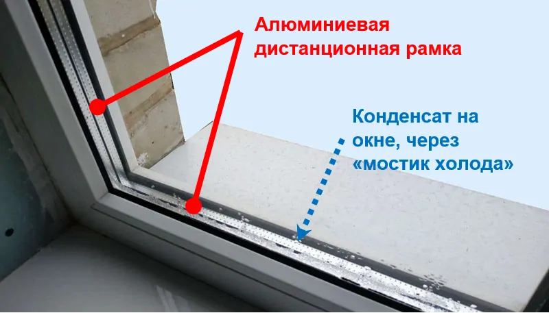 L'aluminium est l'un des rares matériaux à avoir une conductivité thermique très élevée, et dans ce cas, une conductivité à froid. Pour cette raison (plus l'air à l'intérieur de l'unité en verre est plus froid en bas qu'en haut), l'unité en verre commence à se refroidir et à s'embuer non pas quelque part au centre, mais juste en dessous le long du cadre, où l'endroit le plus froid ( zone de bord) se trouve.
