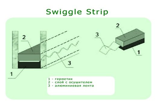 Swingle Strip est une technologie de scellage du verre qui utilise une structure multicouche. La principale caractéristique est l'utilisation d'un scellant aux propriétés absorbantes. Il est appliqué sur le verre sous la forme d'un ruban dense. Ensuite, une couche de papier d'aluminium ondulé est appliquée. Et le dessus est un déshumidificateur.