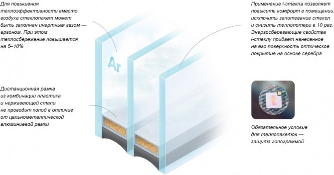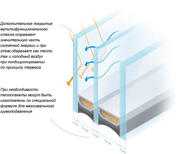 Les packs de chaleur peuvent être équipés de verre multifonctionnel. L'utilisation de telles fenêtres à double vitrage est importante pour un climat fortement continental, lorsque les hivers sont très froids et les étés chauds. Les lunettes multifonctionnelles ont non seulement des propriétés d'économie d'énergie, mais sont également capables de rester au frais.
