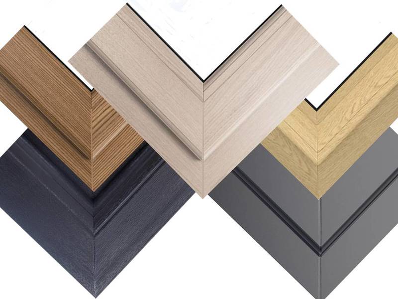 Dans ce mode de réalisation, un film imitant la structure du matériau est appliqué sur un profil noir. Alors que cette technologie est au stade de développement et, malheureusement, le choix de ce type de produits laminés est restreint.