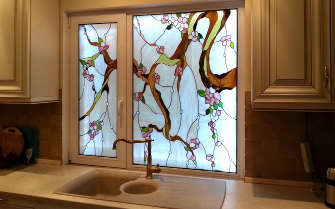 Parmi le design exclusif de la fenêtre, on peut appeler des options avec l'application de mosaïques sur verre ou l'utilisation de vitraux. Cette solution est laborieuse et pas bon marché, mais elle peut certainement devenir un point culminant de votre maison.