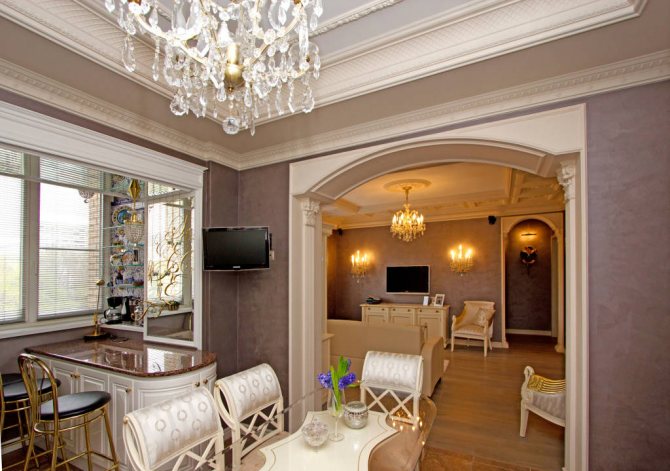 Mais tout a ses avantages. Vous pouvez choisir n'importe quelle corniche décorative et la fixer sur le mur au-dessus de la fenêtre, ou le long de la ligne du bas de l'arc.