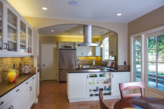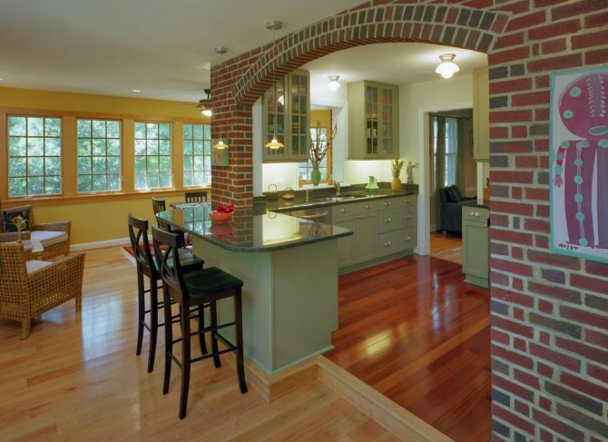 La première étape vers la création d'une pièce qui relie deux pièces adjacentes est de rendre l'espace plus volumineux et ouvert à travers une arche. Pour améliorer le design, vous pouvez ouvrir les murs entre la cuisine et le salon en installant une voûte. En ouvrant le mur et en permettant aux lignes de vue de s'étendre au-delà de la cuisine, vous créez la sensation de plus d'espace sans gaspiller d'espace au sol.