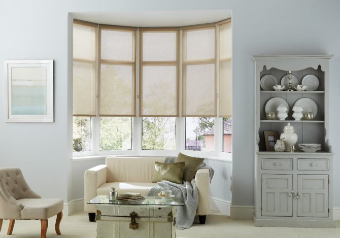 Sur la photo, il y a des stores romains sur chaque fenêtre d'une baie vitrée polygonale.